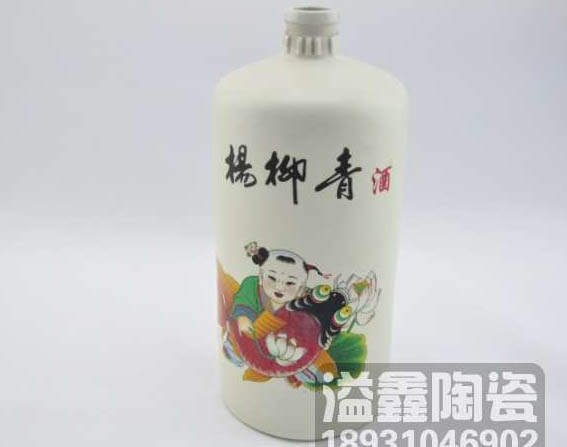 此酒产自天津,瓶体采用白瓷,用年画福娃作为贴纸装饰。器形圆柱型,圆润饱满,图片上福娃抱着一条大鱼预示着美好的年景,和睦的家庭。传承中华民族文化精髓与现代包装设计相结合,陶瓷工艺上属于工艺较简单的酒瓶。